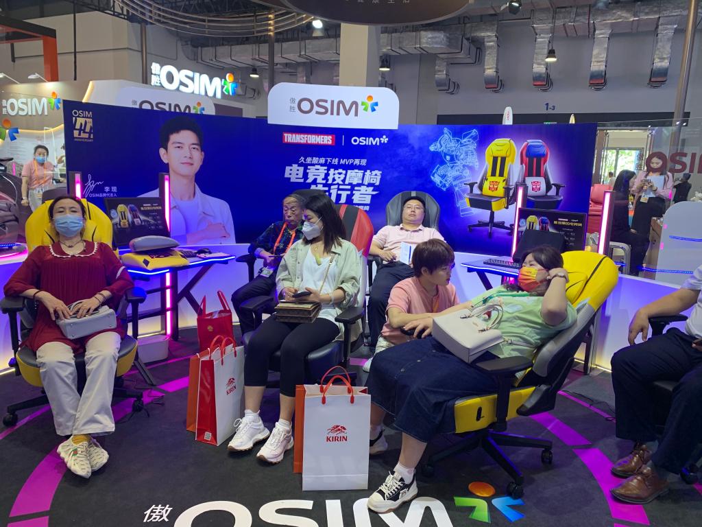 前来体验电竞按摩椅的观展者络绎不绝。“这一上午已经卖出去十几台,还有许多有意向的客户留了联系方式。”现场工作人员介绍说,电竞按摩椅除了具有按摩功能,还与电影《变形金刚》中的角色“大黄蜂”进行联名,以此吸引年轻的电竞爱好者消费。
