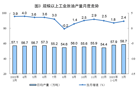 原油生产略有加快,进口由降转增。3月份,生产原油1818万吨,同比增长2.4%,增速比1—2月份加快0.6个百分点,日均产量58.7万吨。进口原油5231万吨,同比增长22.5%,1—2月份为下降1.3%。
