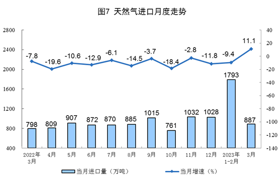 天然气生产有所放缓,进口由降转增。3月份,生产天然气205亿立方米,同比增长4.0%,增速比1—2月份放缓2.7个百分点,日均产量6.6亿立方米。进口天然气887万吨,同比增长11.1%,1—2月份为下降9.4%。