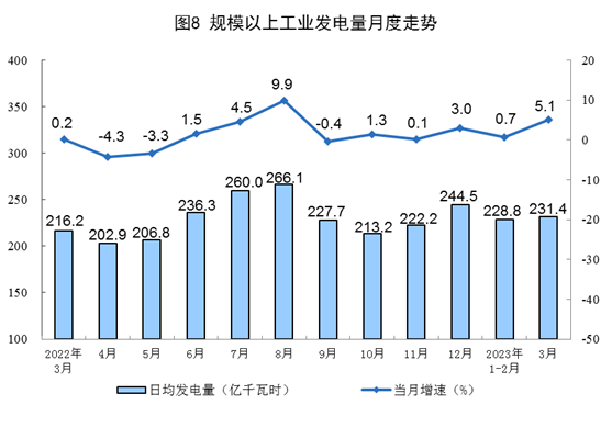电力生产增速加快。3月份,发电7173亿千瓦时,同比增长5.1%,增速比1—2月份加快4.4个百分点,日均发电231.4亿千瓦时。1—3月份,发电20712亿千瓦时,同比增长2.4%。