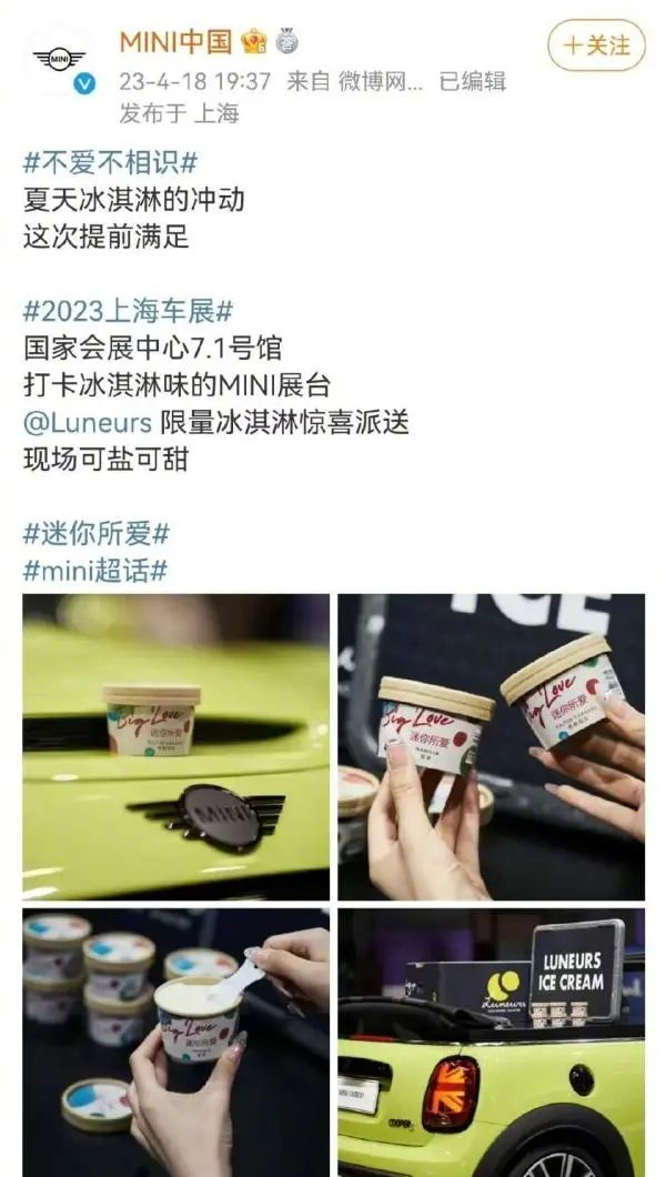 据网友提供的截图显示,宝马MINI微博@MINI中国账号曾于4月18日发布微博表示,宝马MINI展台的冰淇淋限量派送。目前该微博已不可见。