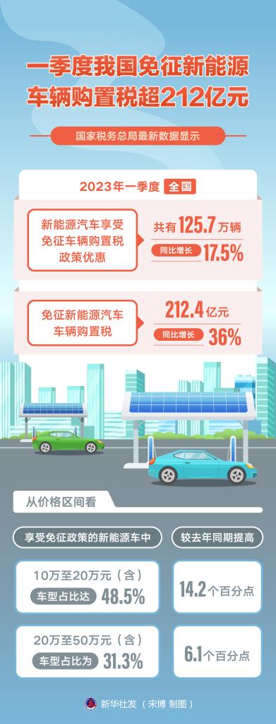 新华社北京4月25日电(记者王雨萧)国家税务总局最新数据显示,今年一季度,全国共有125.7万辆新能源汽车享受免征车辆购置税政策优惠,同比增长17.5%;免征新能源汽车车辆购置税212.4亿元,同比增长36%。