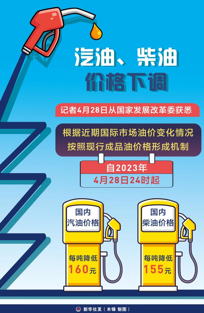 新华社北京4月28日电(记者 潘洁)记者28日从国家发展改革委获悉,根据近期国际市场油价变化情况,按照现行成品油价格形成机制,自2023年4月28日24时起,国内汽油、柴油价格每吨分别降低160元和155元。
