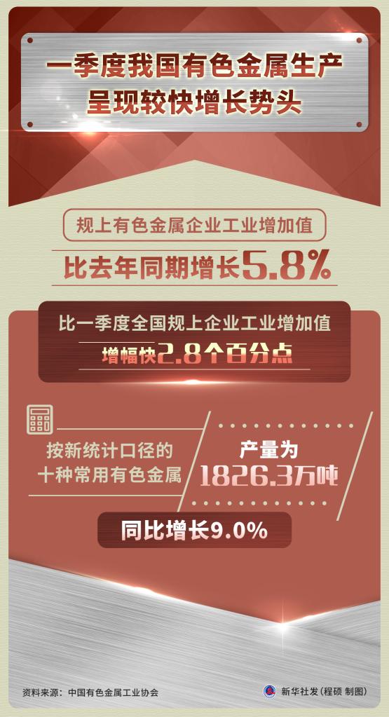 新华社北京5月4日电(记者刘夏村)一季度我国有色金属生产呈现较快增长势头,规上有色金属企业工业增加值比去年同期增长5.8%,比一季度全国规上企业工业增加值增幅快2.8个百分点;按新统计口径的十种常用有色金属产量为1826.3万吨,同比增长9.0%。