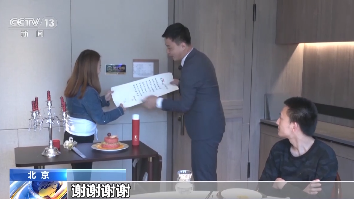 让张荣满口称赞的崔兵强,是一位宴会定制师,他的工作就是让消费者的各种纪念日都有仪式感,为了这场生日宴,崔兵强不仅精心布置就餐环境,还用毛笔为客人写了一首自己作的词,以生日为主题,把参加生日宴的五位客人的名字都取了一个字藏在这首词里。