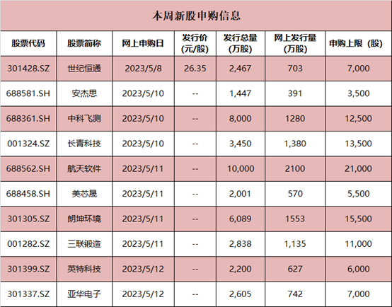 本周(5月8日—5月12日),共有10只新股将进行申购,其中深市主板2只(长青科技、三联锻造)、创业板4只(世纪恒通、朗坤环境、英特科技、亚华电子)、科创板4只(安杰思、中科飞测、航天软件、美芯晟)。