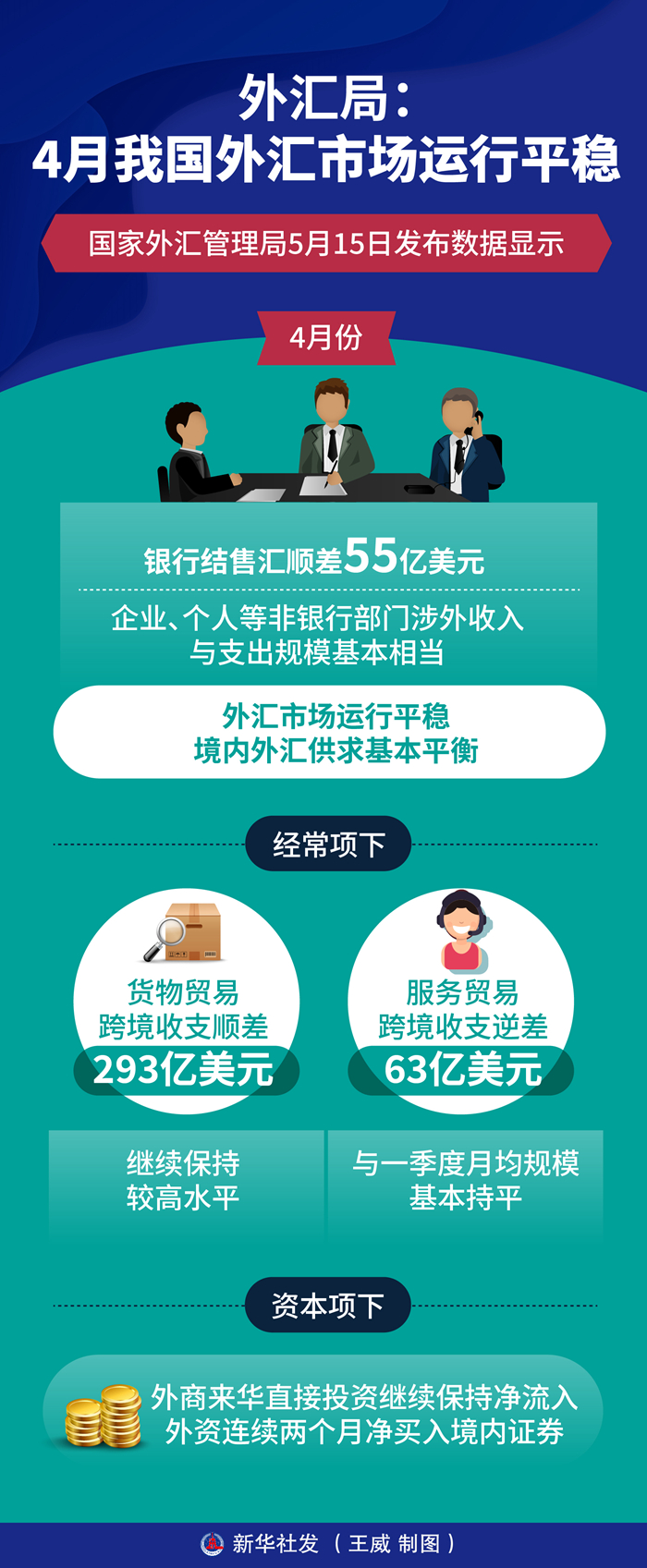 新华社北京5月15日电(记者刘开雄)国家外汇管理局15日发布数据显示,4月份,银行结售汇顺差55亿美元;企业、个人等非银行部门涉外收入与支出规模基本相当。外汇市场运行平稳,境内外汇供求基本平衡。