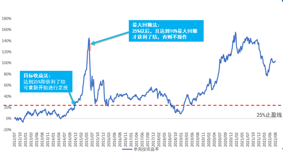 图2:对万得普通股票型基金指数(885000.WI)的过往定投收益率使用目标收益法和最大回撤法举例