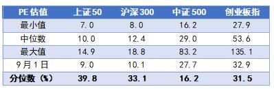 从表1的数据中我们能够发现,截至2022年9月1日,上证50、沪深300、中证500还有创业板指数的PE估值分位数均小于40%。
