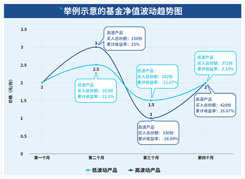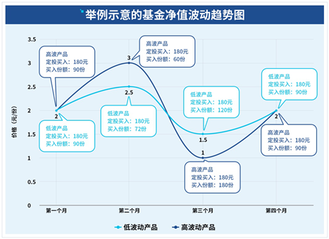 举个例子,我们用深蓝色线代表波动较高的基金产品净值走势,浅蓝色线代表波动较低的基金产品净值走势。假设每期间隔一个月,每月各投入180元,在第4期时,基金净值回到起始数值。