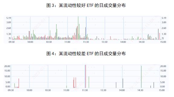 单看成交额等“总量”指标也是不够的,投资者还需要观察成交的“结构”。报价挂单连续性强、日内成交量分布比较均匀的ETF,流动性水平也会更佳。