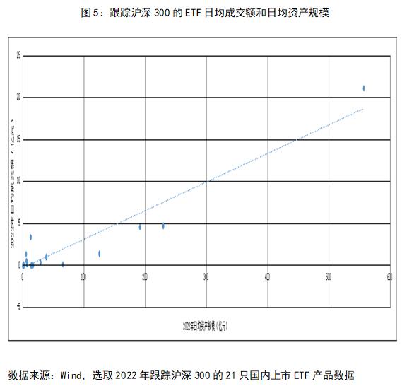 第二,看规模。除特殊情况外,通常ETF资产规模越大,代表市场认可度越高,持有人数量多,流动性一般也会更好。以2022年跟踪沪深300的21只ETF产品为例,可以看出日均资产规模与日均成交额呈现出一定的正相关关系(见图5),规模越大的ETF流动性越好,且分化明显。