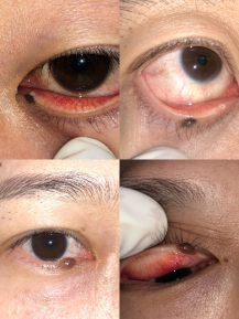 一般色素痣未累及睑缘和灰线,切除和修复相对容易,仅仅涉及前层眼睑缺损的再造和修复,如果越过灰线,累及眼睑内侧的睑板和睑结膜,就要涉及眼睑的全层切除,眼睑全层缺损的再造和修复,就会比较复杂,因为眼睑的前层和后层都需要重建和再造,术后外观和好眼比较,还是差距比较大的。另外,睫毛也会和色素痣一起切除,色素痣范围面积大的话,就会造成眼睑睫毛的缺失,年轻女性或者爱美的人士就会涉及术后戴假睫毛或者睫毛种植。(图3)