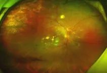 左:正常人左眼眼底彩照;右:正常人左眼超广角激光扫描眼底照