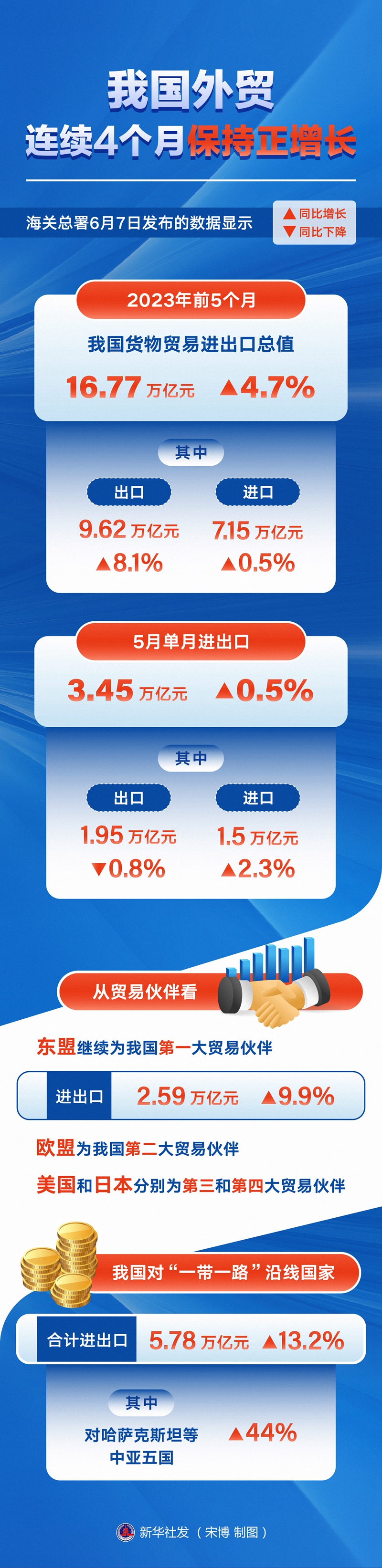 新华社北京6月7日电(记者邹多为)面对外需走弱带来的挑战,我国外贸韧性持续显现。海关总署7日发布的数据显示,今年前5个月,我国货物贸易进出口总值16.77万亿元,同比增长4.7%。其中5月单月进出口3.45万亿元,增长0.5%,月度进出口连续4个月保持正增长。
