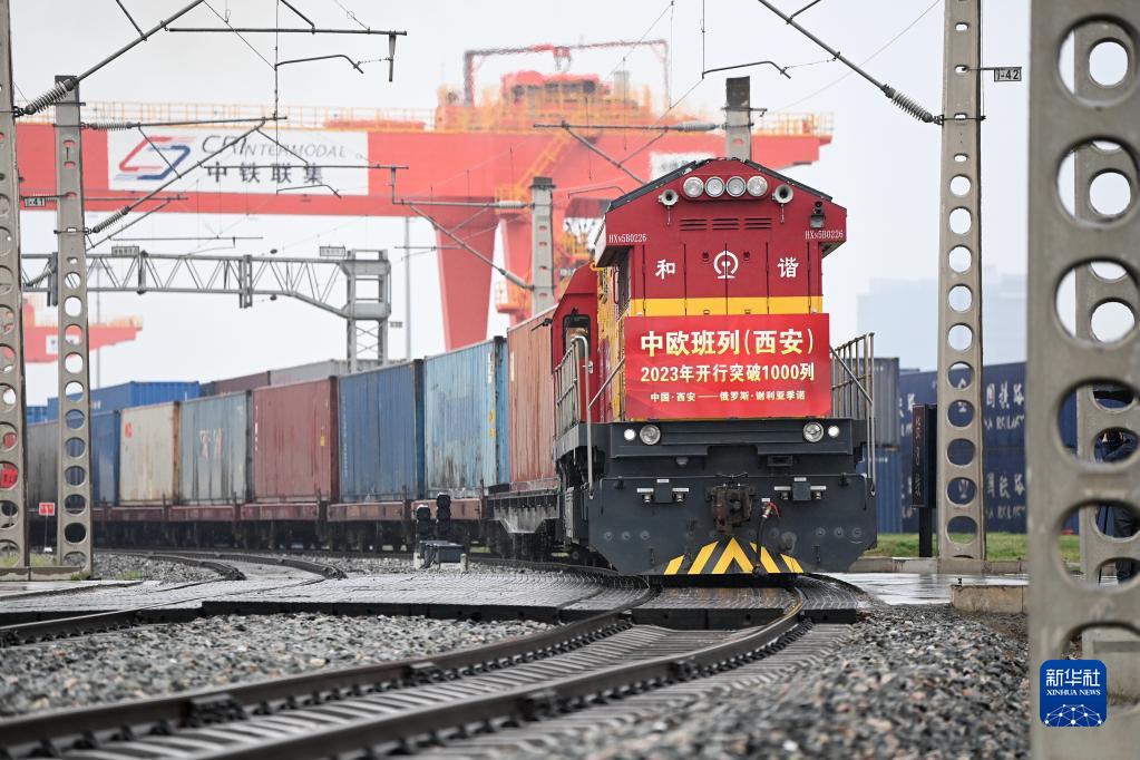 3月23日,X8489次中欧班列从西安国际港站驶出开往俄罗斯谢利亚季诺。新华社记者 李一博 摄
