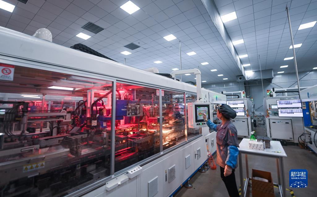 4月11日,在位于浙江省湖州市吴兴区织里镇的浙江贝盛绿能科技有限公司的车间内,自动化流水线在加紧生产出口欧洲的光伏组件。新华社记者 徐昱 摄