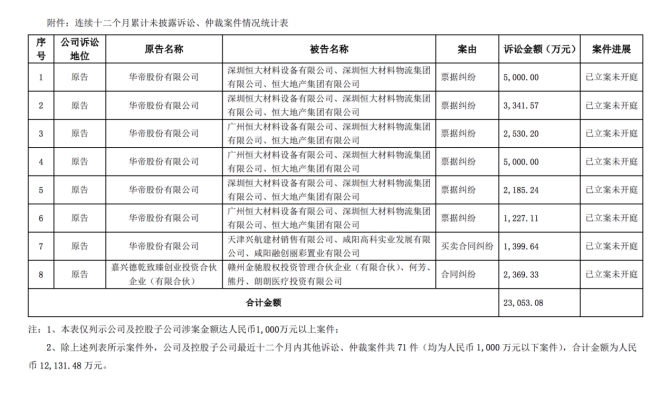 此外,华帝股份及控股子公司不存在其他应披露而未披露的重大诉讼、仲裁事项。鉴于部分案件尚未开庭审理或尚未结案,其对公司本期利润或期后利润的影响存在不确定性。