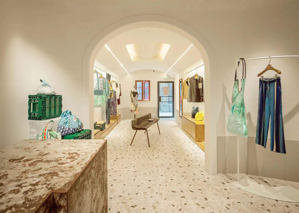 用旧衣料重新拼接设计制作而成的衬衫,用塑料垃圾回收粉碎、环保再生制成的包包,用农作物废料和水果残渣通过科技再生制成的新潮皮草……在上海北外滩一片百年石库门老建筑群里,坐落着一家名为“再造衣银行”的服装店。
