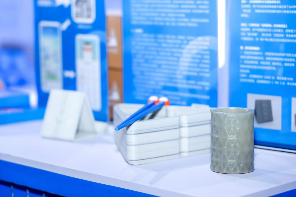 上海碳博会上展出的用外卖餐盒回收材料3D打印成的笔筒、收纳盒(2023年6月12日摄)。新华社记者王默玲 摄