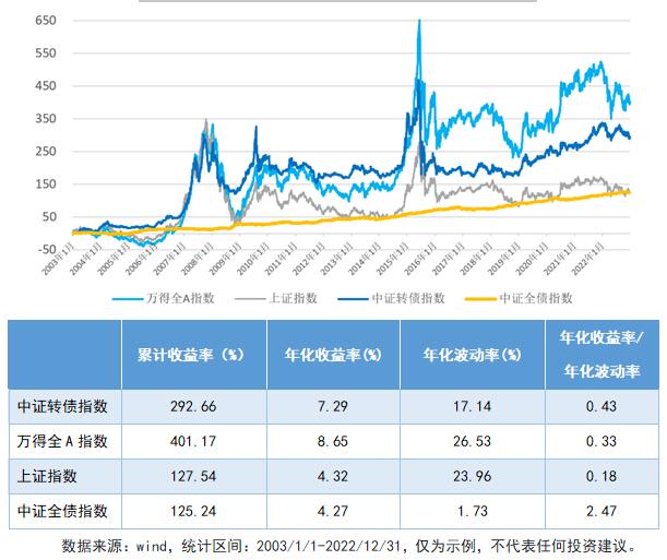 从历史数据来看,相对股票资产,可转债整体收益率走势方向与股市代表性指数近似(2003年以来的累计收益率大幅超越了上证指数),一些阶段的波动和回撤幅度也相对股票指数低,整体来看呈现出更好的收益-风险性价比。尤其在股市趋势性行情中,可转债收益表现也有机会不遑多让,如果再考虑可加杠杆、T+0交易等因素,进攻性甚至可能更加锐利(需承担的风险也会相应提高)。相对普通债券资产,可转债整体累计收益优势明显,具有相对更大的收益弹性,当然相对波动幅度明显更大。