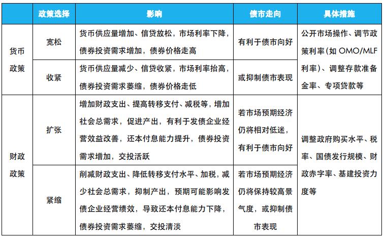 政策对债市的影响是动态、多维、立体的,不是静态、单向、平面的,不同经济环境下,各类政策交织协同发挥作用,可能摆出的组合选项也多种多样,力度强弱不同且会适时切换(如“紧信用+宽货币+宽财政”、“宽信用+宽货币+宽财政”等等)。
