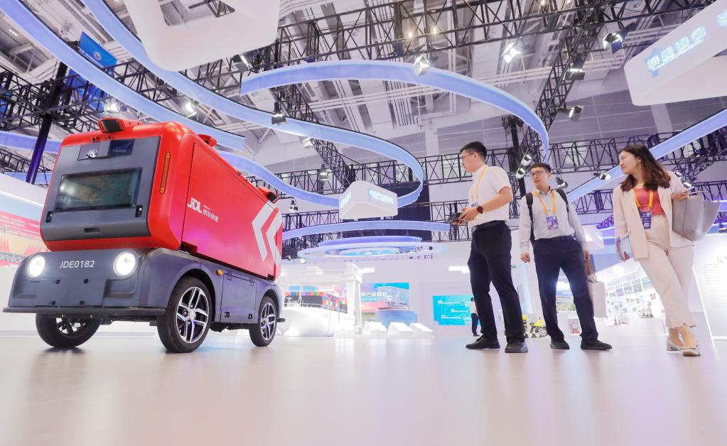 在2023中国·廊坊国际经济贸易洽谈会上,工作人员在物流强省展区向嘉宾展示无人配送车。新华社发(陈童 摄)