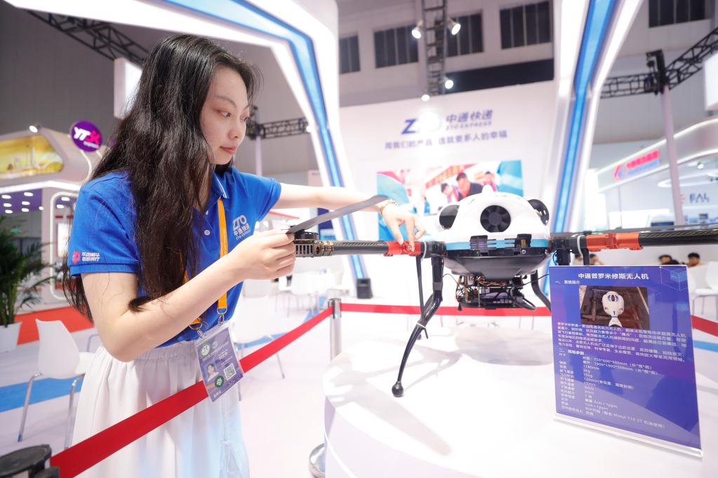 在2023中国·廊坊国际经济贸易洽谈会上,工作人员在智慧物流展区调试无人机。新华社发(陈童 摄)