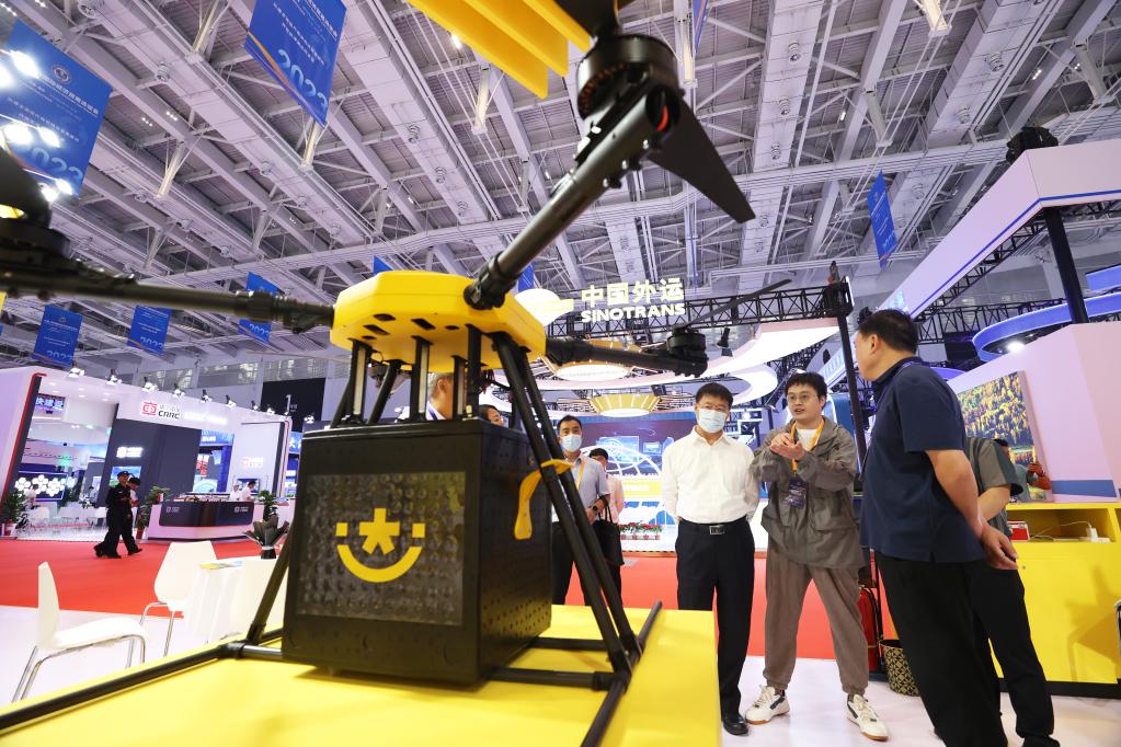 在2023中国·廊坊国际经济贸易洽谈会上,工作人员在智慧物流展区向嘉宾介绍物流无人机。新华社发(贾珺 摄)