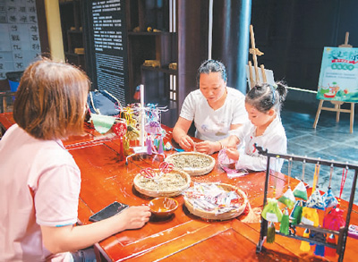 端午节假期,在湖南省汨罗市屈子祠镇屈子文化园内,游客正制作香囊。新华社记者 陈思汗摄