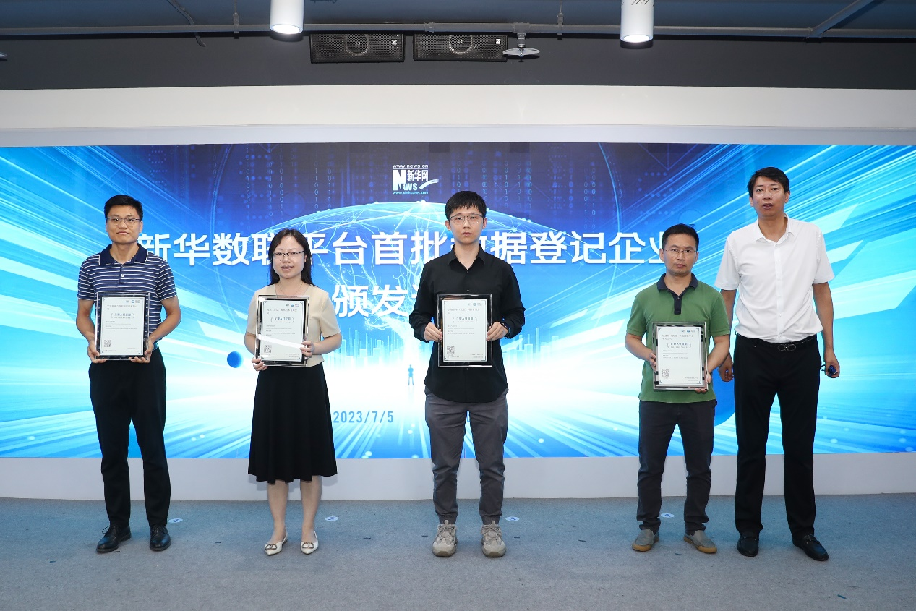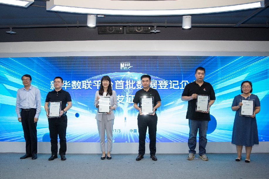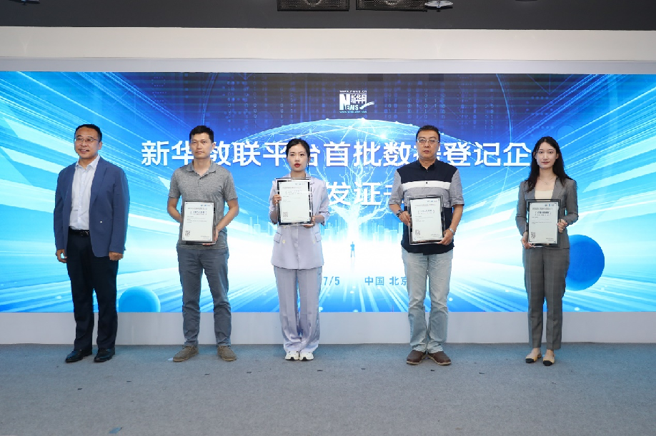 现场新华数联平台为北京中科联通科技有限责任公司、山东省胶东供应链服务有限公司、晓数绿景(北京)科技发展有限公司、联联加(营口)产业发展有限公司、开运集团等企业颁发企业入驻证明证书。新华网 陈杰 摄