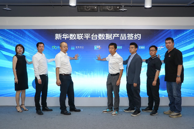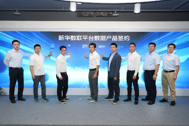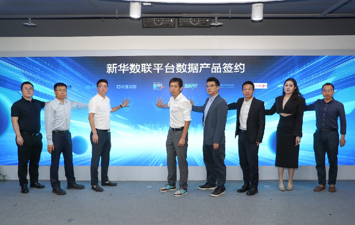 新华数据要素联合平台邀请测试发布会现场举行数据产品签约仪式,新华网数字产业部总监任燚代表新华网上台签约。图为新华网、北京逸融科技发展有限公司、北京中科联通科技有限责任公司、天创信用服务有限公司、启客(北京)科技有限公司、深圳市洞见智慧科技有限公司、长城计算机软件与系统有限公司、上海效科数字科技有限公司等上台签约。新华网 陈杰 摄
