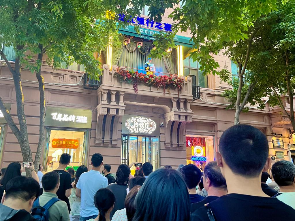 日落时分,霓虹初上,缀满鲜花的音乐阳台上飘来悠扬的乐曲,熙熙攘攘的游客蓦然驻足,欣赏异国艺术家的精彩演奏,或拿起手机拍照,或伴着旋律轻轻摇摆,享受夜幕下的“冰城”。