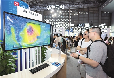 在2023世界人工智能大会上,人们在观看华为云盘古气象大模型。