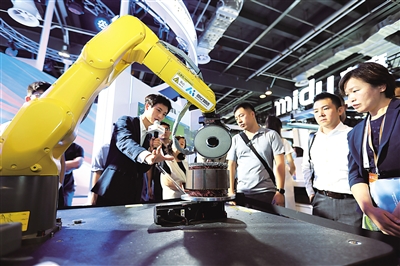 在2023世界人工智能大会上,工作人员为参观者介绍工小匠AI数字质检员利用AI技术进行产品外观缺陷检测。新华社记者 王翔 摄