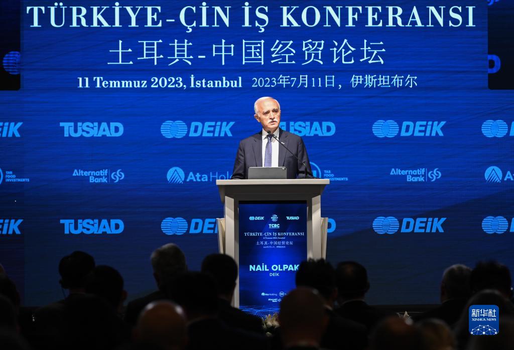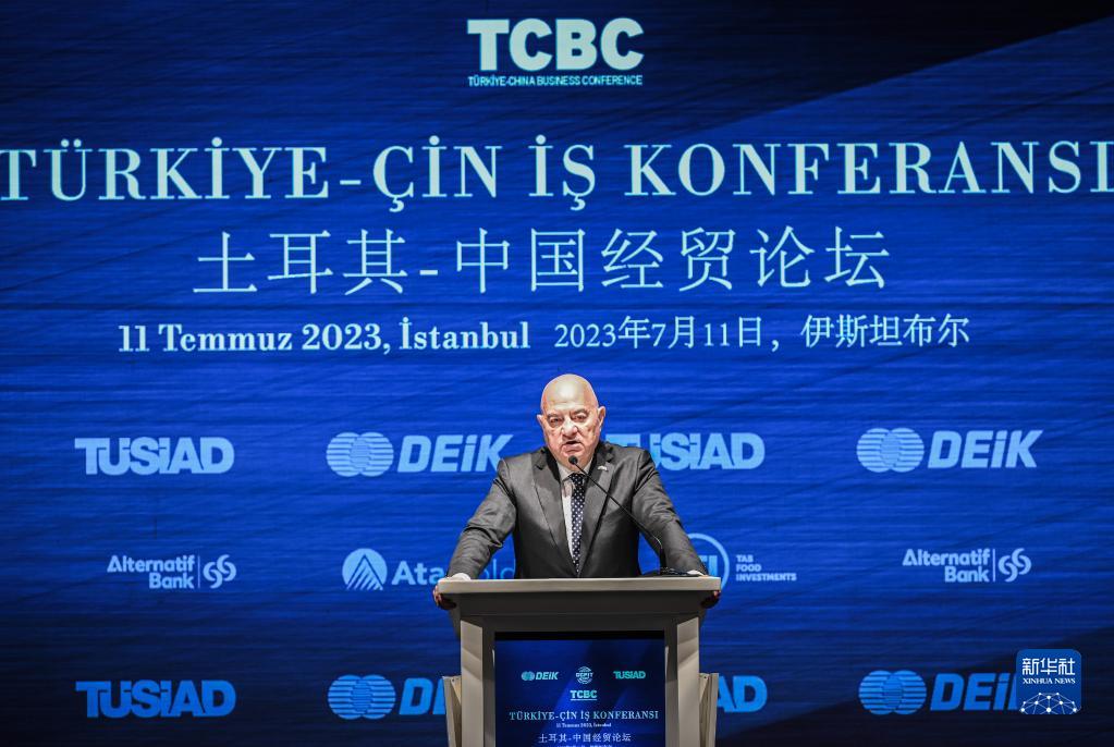 7月11日,土耳其对外经济关系委员会主席奥尔帕克在伊斯坦布尔举行的中土经贸论坛上讲话。新华社发(厄梅尔·库什朱摄)