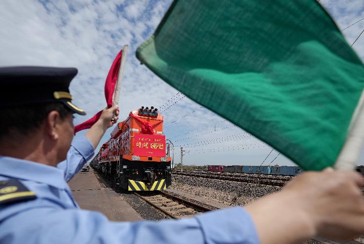 6月11日,接车员在曹妃甸站附近的一货场站台迎接从蒙古国乌兰巴托开来的煤炭集装箱班列。新华社记者杨世尧摄