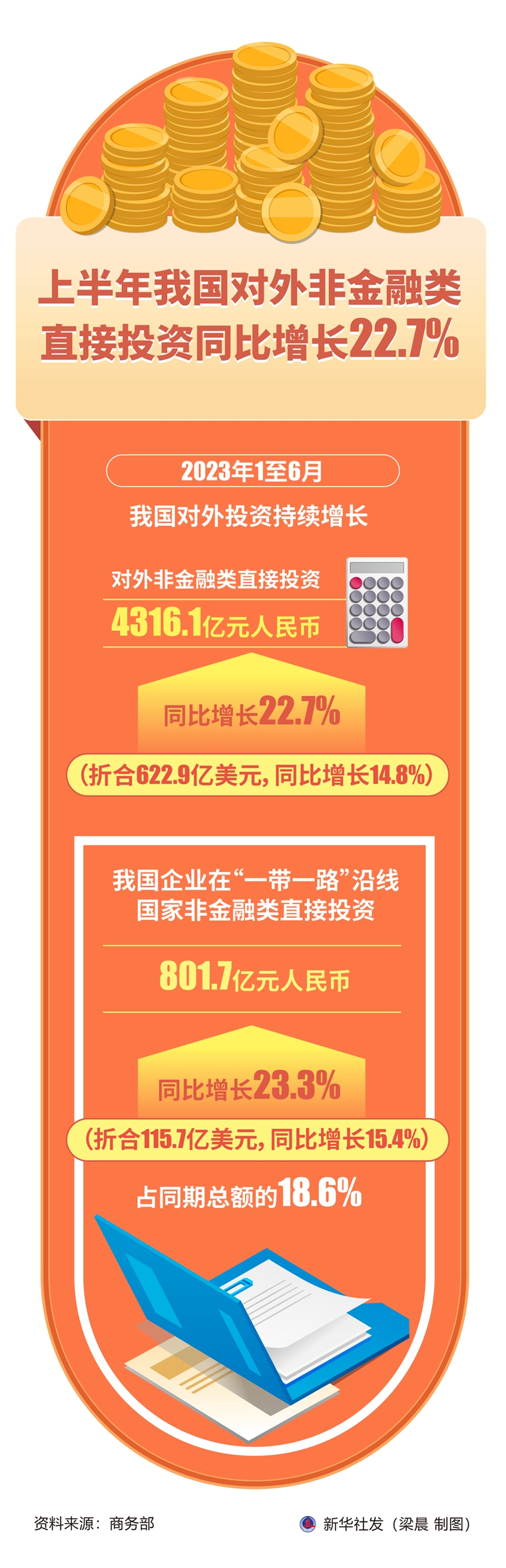 新华社北京7月20日电(记者 谢希瑶)商务部20日发布数据显示,今年1至6月,我国对外投资持续增长,对外非金融类直接投资4316.1亿元人民币,同比增长22.7%(折合622.9亿美元,同比增长14.8%)。