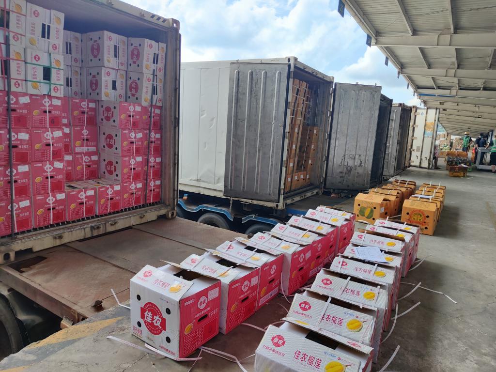 广西凭祥市友谊关口岸,接收完一批新鲜榴莲后,凭祥市光腾进出口贸易有限公司总经理农丽清随即安排转运,将榴莲发给广东、浙江等地客户。“今年上半年,公司榴莲进口量比去年同期翻了一倍,现在每天还保持十几个货柜的进口量。”农丽清说。