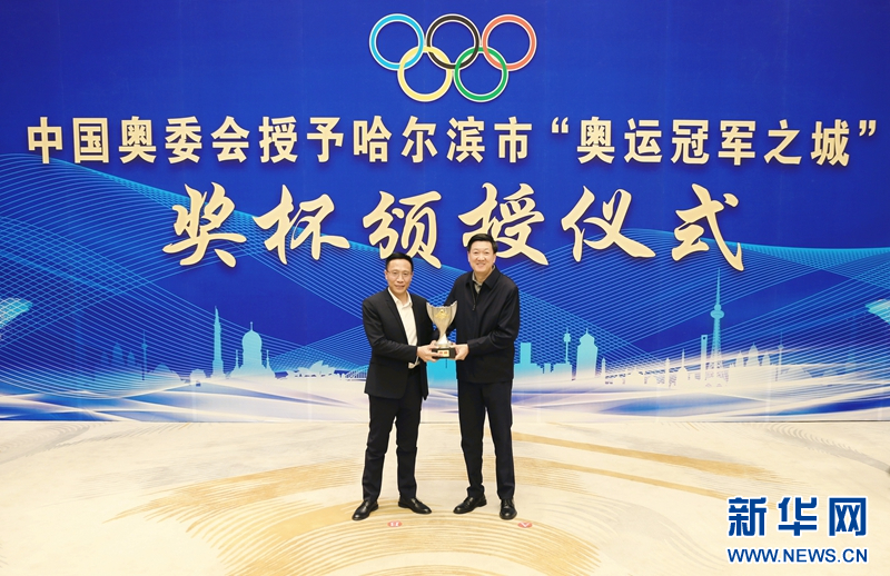 中国奥委会授予哈尔滨市“奥运冠军之城”奖杯。