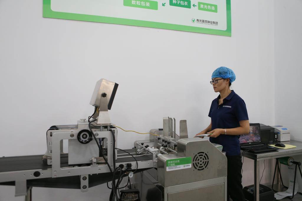 7月26日,山东寿光蔬菜种业集团工人在包装车间给种子包装袋打码。(新华社记者张浩波 摄)
