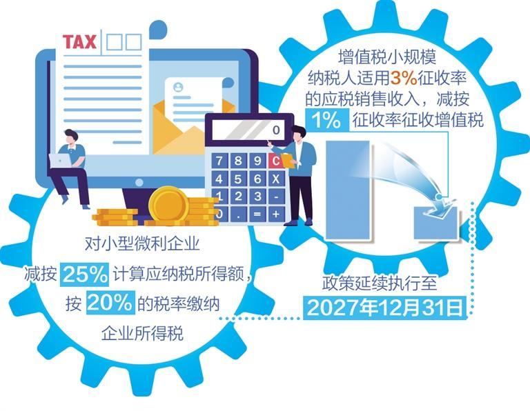 值得关注的是,小规模纳税人减免增值税政策也延续至2027年底。按照规定,对月销售额10万元以下(含本数)的增值税小规模纳税人,免征增值税。增值税小规模纳税人适用3%征收率的应税销售收入,减按1%征收率征收增值税;适用3%预征率的预缴增值税项目,减按1%预征率预缴增值税。