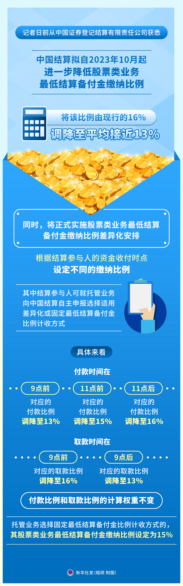具体来看,付款时间在9点前、11点前和11点后对应的付款比例分别调降至13%、15%和16%,取款时间在9点前和9点后对应的取款比例分别调降至16%和13%,付款比例和取款比例的计算权重不变;托管业务选择固定最低结算备付金比例计收方式的,其股票类业务最低结算备付金缴纳比例设定为15%。
