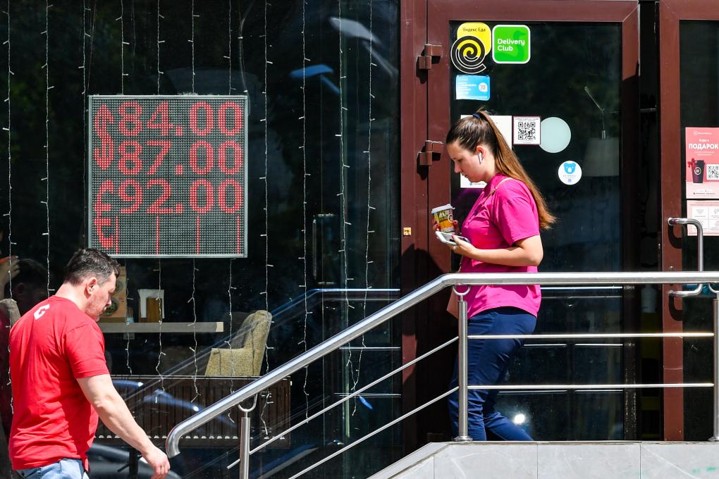6月26日,在俄罗斯首都莫斯科,行人经过一家外汇兑换点。(新华社记者曹阳摄)