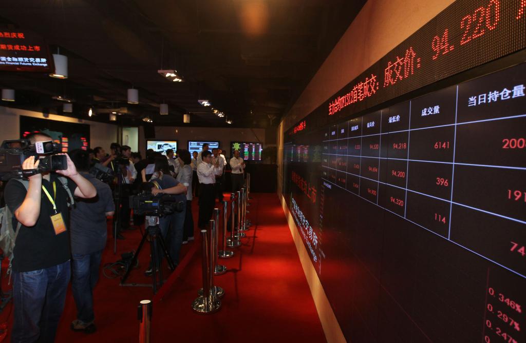 2013年9月6日,5年期国债期货在中国金融期货交易所成功上市,填补了我国场内利率衍生品的空白,开启了金融期货市场的新篇章。图为嘉宾和媒体记者正在上市仪式上关注国债期货交易行情。(新华社资料照片)