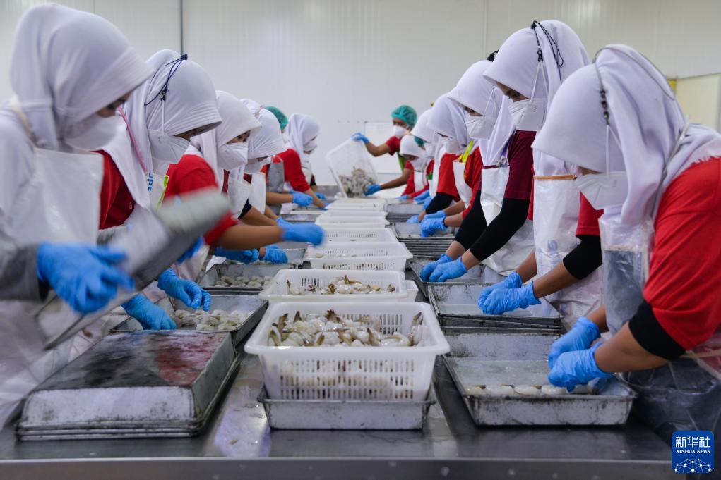 8月29日,在印度尼西亚中爪哇省三宝垄市,工人在福建淼天汇食品有限公司印尼公司的对虾加工生产线上工作。新华社记者 徐钦 摄