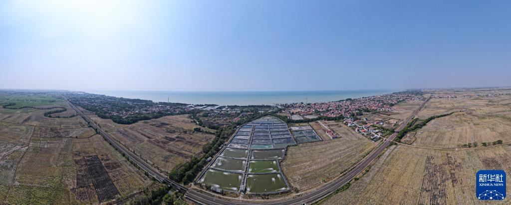 8月28日在印度尼西亚中爪哇省三宝垄市佩马朗区拍摄的一处南美白对虾养殖场(无人机全景照片)。新华社记者 徐钦 摄
