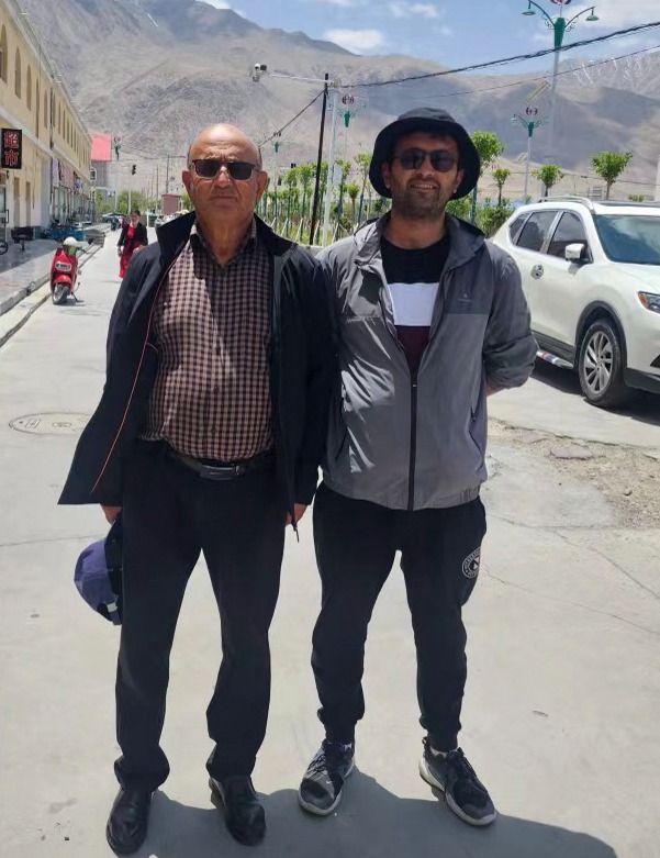 巴基斯坦商人赛福拉(左)和儿子卡里姆在中国新疆塔县街头合影。新华社发(受访者供图)