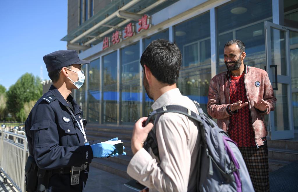 两名巴基斯坦商人在我国新疆红其拉甫口岸办理通关手续。新华社记者 胡虎虎 摄