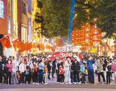 北京路,是广州建城2000多年从未偏移、从未断代的城市中轴线,也是全国最早实行步行化管理的商业街。同时,北京路商圈是首批全国示范智慧商圈。图为在位于广州市越秀区的北京路步行街,大批市民和游客前往游览,并在路口驻足观看大型裸眼3D动画。魏劲松摄(人民图片)